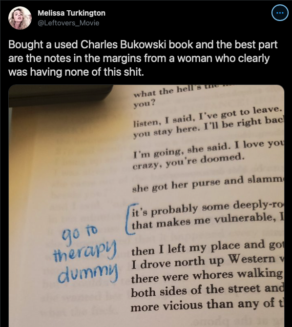 But every once in a while, that sheer volume, its amazing reach, works in our favor. Yesterday, I ran across this thread by Melissa Turkington (note) about a used book she bought and its previous owner's marginalia. The notes would have been hilarious all by themselves.